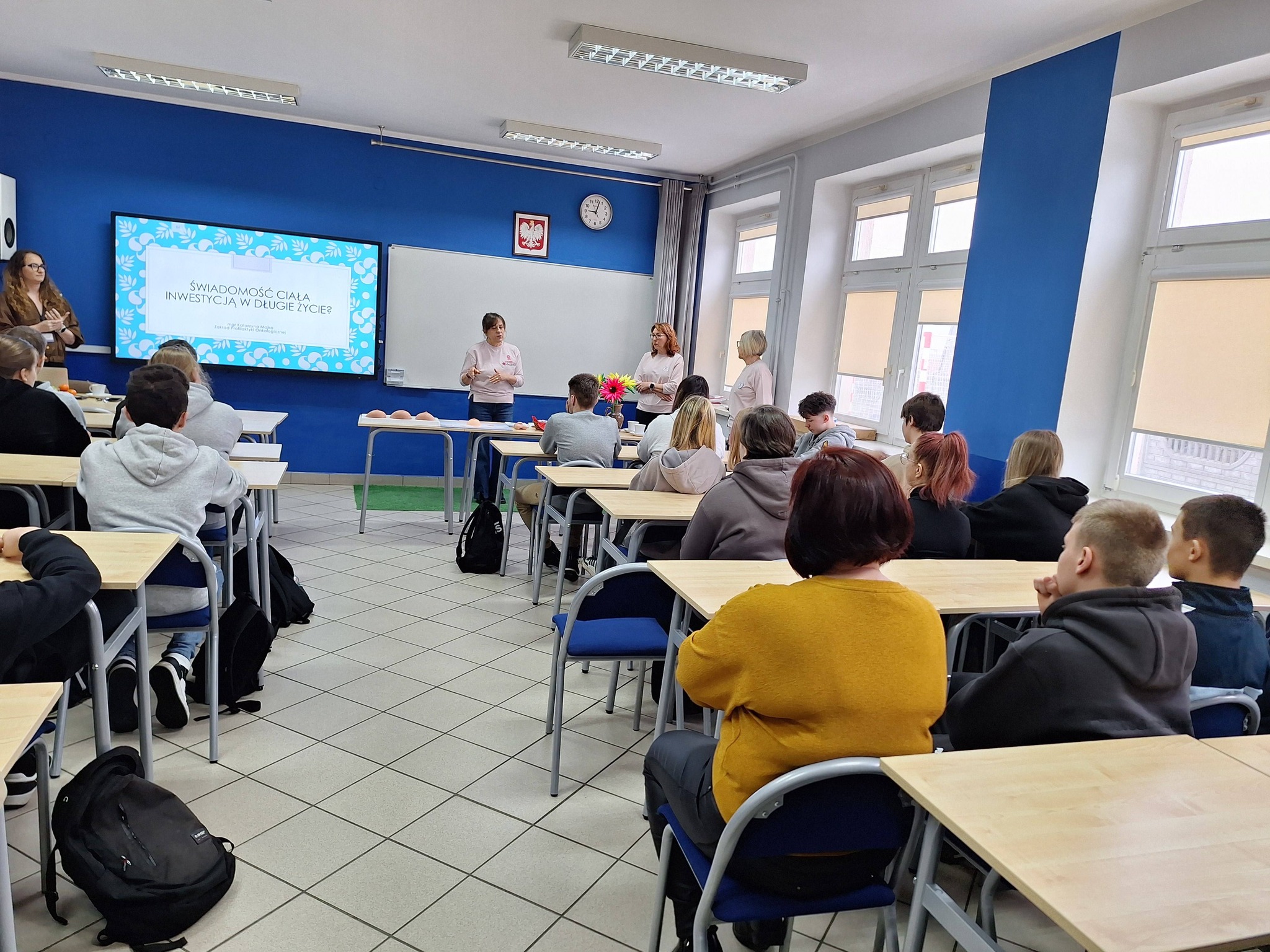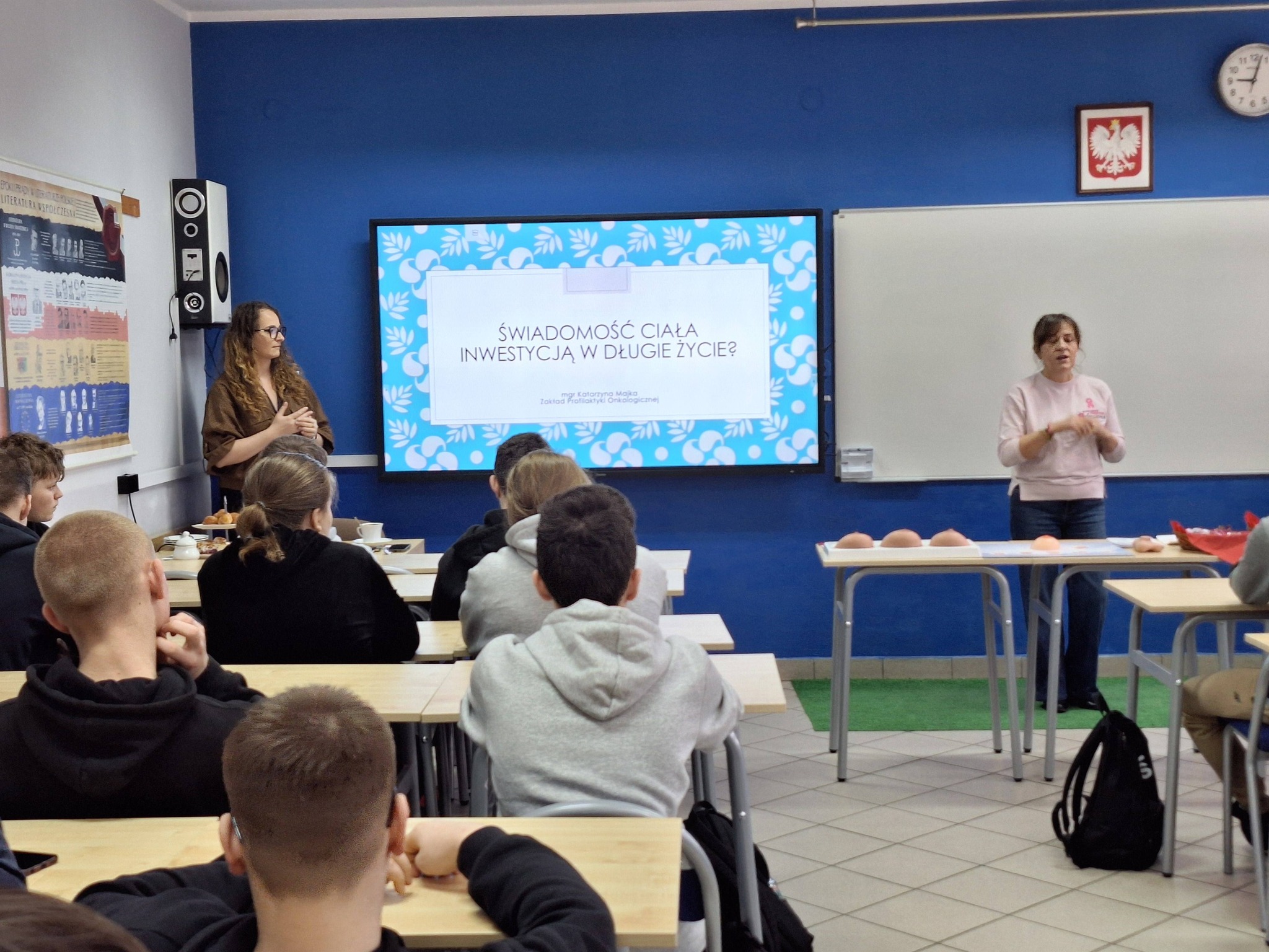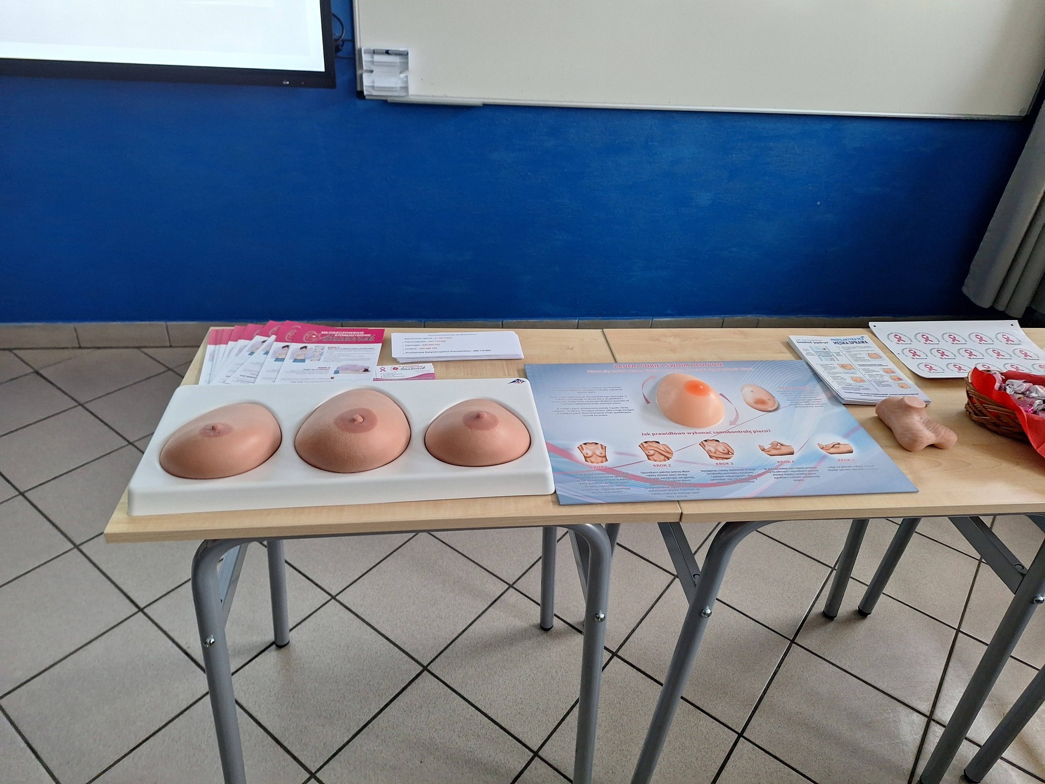 Tematem przewodnim było samobadanie, czyli najprostsza, a zarazem najskuteczniejsza metoda wczesnego wykrywania chorób nowotworowych. Pani Katarzyna w niezwykle przystępny i merytoryczny sposób pokazała: