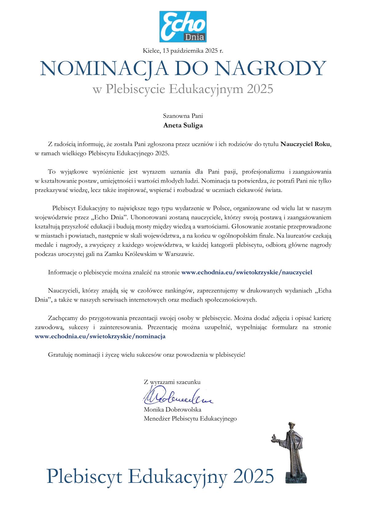 Z przyjemnością informujemy, iż Pani Aneta Suliga otrzymała nominację do tytułu Nauczyciel Roku w ramach Plebiscytu Edukacyjnego 2025, prowadzonego przez Echo Dnia.