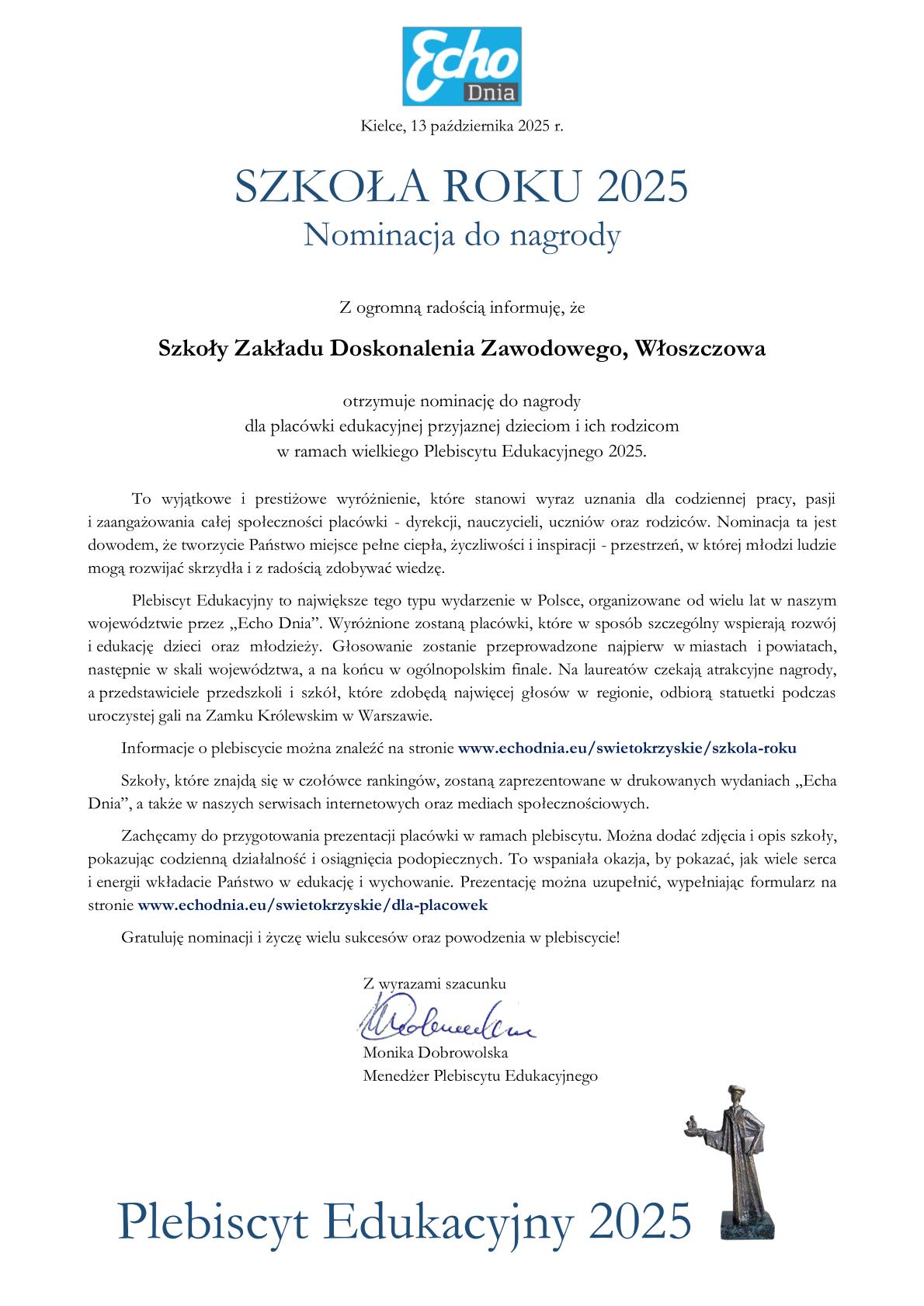 Z przyjemnością informujemy, iż Szkoły ZDZ we Włoszczowie otrzymały nominację do nagrody dla placówki edukacyjnej przyjaznej dzieciom i ich rodzicom w ramach Plebiscytu Edukacyjnego 2025, prowadzonego przez Echo Dnia.
