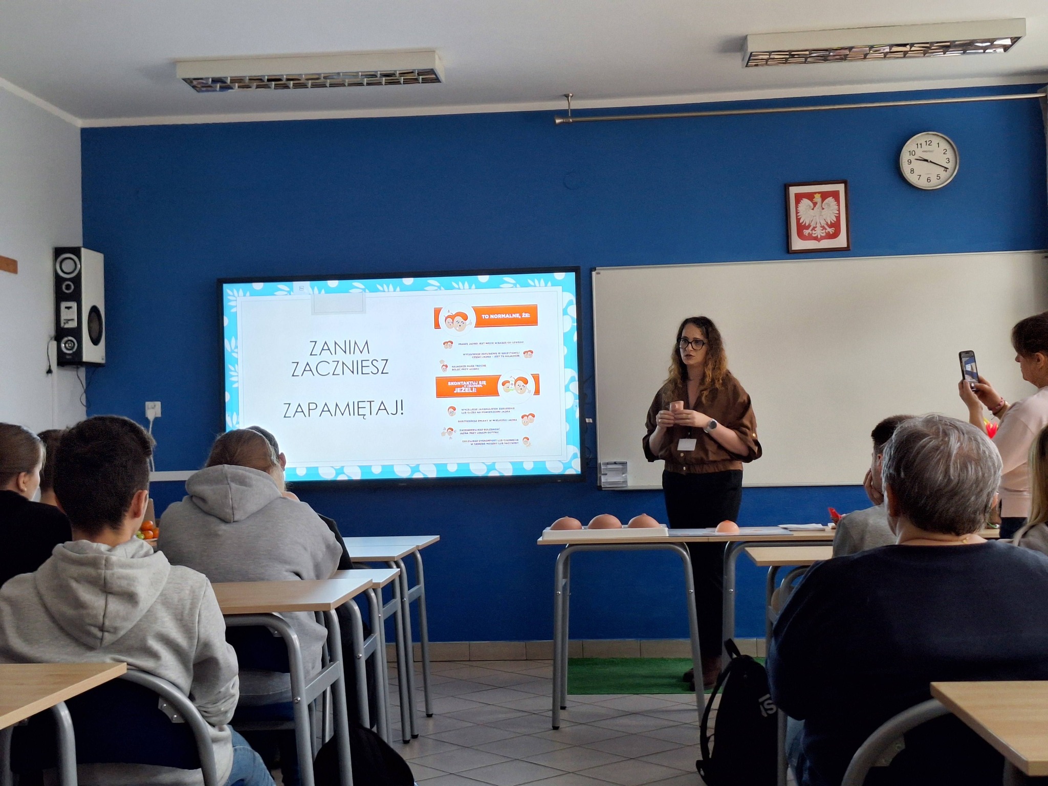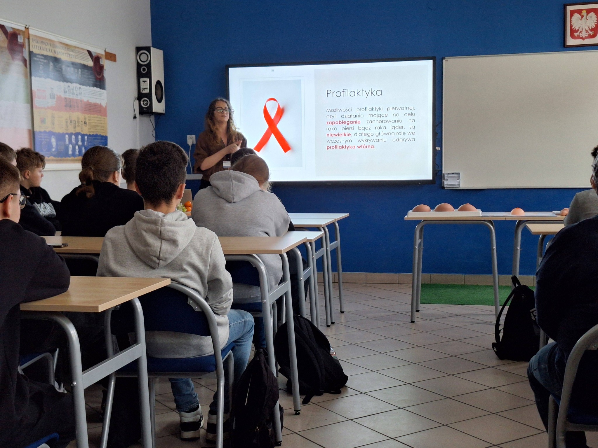 Tematem przewodnim było samobadanie, czyli najprostsza, a zarazem najskuteczniejsza metoda wczesnego wykrywania chorób nowotworowych. Pani Katarzyna w niezwykle przystępny i merytoryczny sposób pokazała: